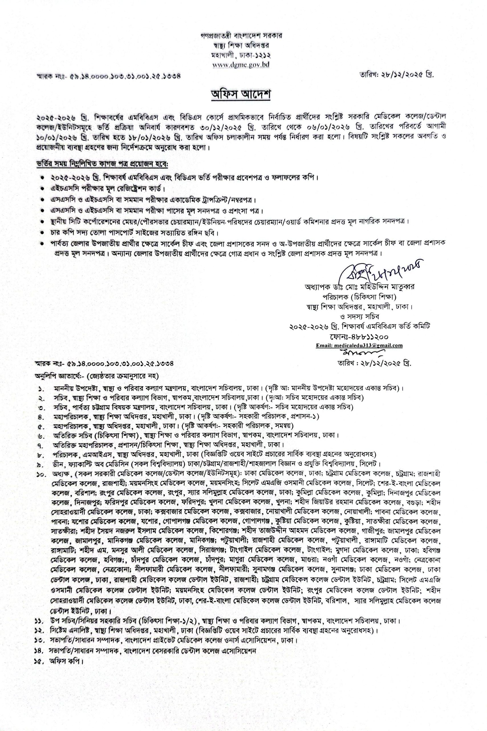 ২০২৫–২০২৬ শিক্ষাবর্ষে এমবিবিএস ও বিডিএস ভর্তি কার্যক্রম ও সময়সূচি পরিবর্তন সংক্রান্ত অফিস আদেশ