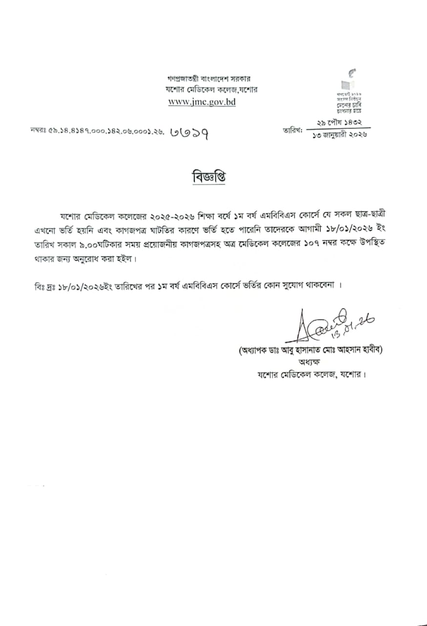 ১ম বর্ষ এমবিবিএস কোর্সে যশোর মেডিকেল কলেজে ভর্তি সম্পর্কিত জরুরী বিজ্ঞপ্তি